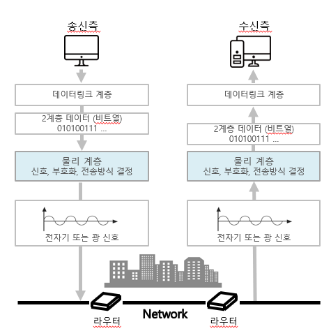 데이터링크 계층으로부터 한 단위의 데이터를 받아 통신 링크를 따라 전송될 수 있는 형태로 변환