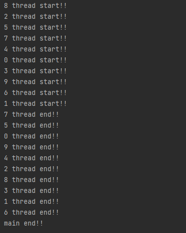0번 스레드부터 9번 스레드까지 순서대로 실행되지 되지 않고 그 순서가 일정치 않은 것을 보면 스레드는 순서에 상관없이 동시에 실행된다는 사실을 알 수가 있습니다. 그리고 스레드가 종료되기 전에 main 메서드가 종료되었다는 사실이다. main 메서드 종료 시 "main end"라는 문자열이 출력되는데 위 결과에서는 제일 처음에 출력이 되어있습니다.
