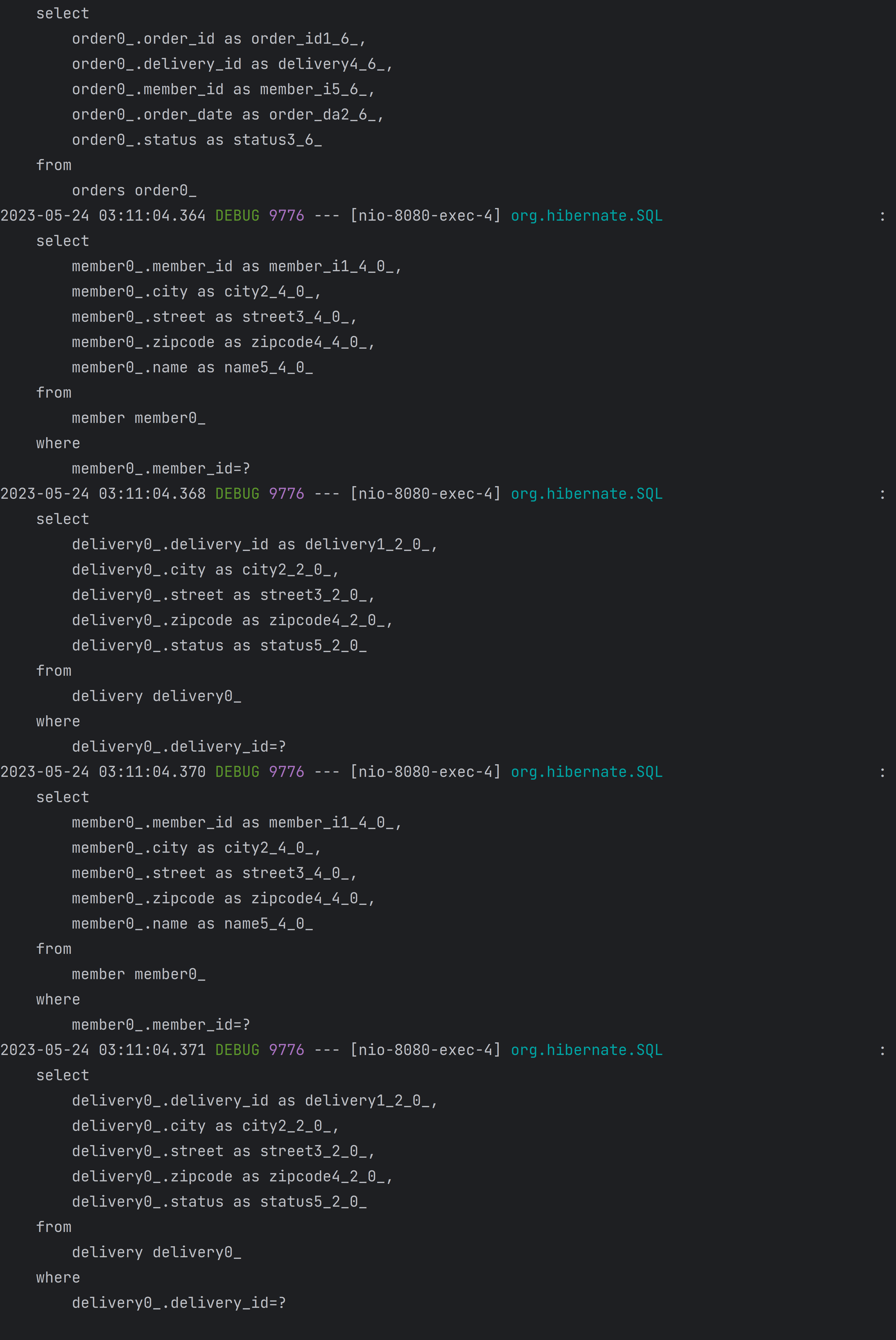 겉으로 보기에는 문제가 없어보이지만, getMember()와 getDelivery()가 호출되고 나면 저희가 의도치 않은 무수한 쿼리들을 보실 수 있습니다.