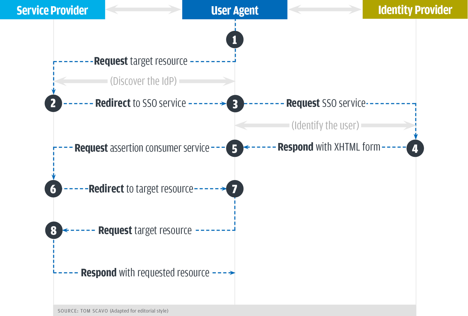 - 서비스 제공자인 SAML은 서버의 자원에 접속하려고 시도, 서비스 제공자는 이미 인증됐는지를 확인, 그렇지 않는 경우 서비스 공급자는 인증 프로세스를 시작, 이미 인증됐다면 바로 7단계(Request target resource)