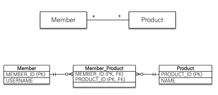 관계형 데이터베이스는 정규화된 테이블이 2개로 다대다 관계로 표현할 수 없습니다. 연결 테이블을 추가해서 일대다, 다대일 관계로 풀어내야 합니다.